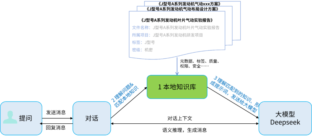 當(dāng)用戶提出問題(如“J型號A系列發(fā)動機葉片的進氣參數(shù)設(shè)計值是多少”)時,系統(tǒng)首先需要理解問題的語義,并在本地知識庫中檢索相關(guān)的知識(如“J型號A系列發(fā)動機”“葉片”“進氣參數(shù)”“設(shè)計值”等關(guān)鍵詞)。