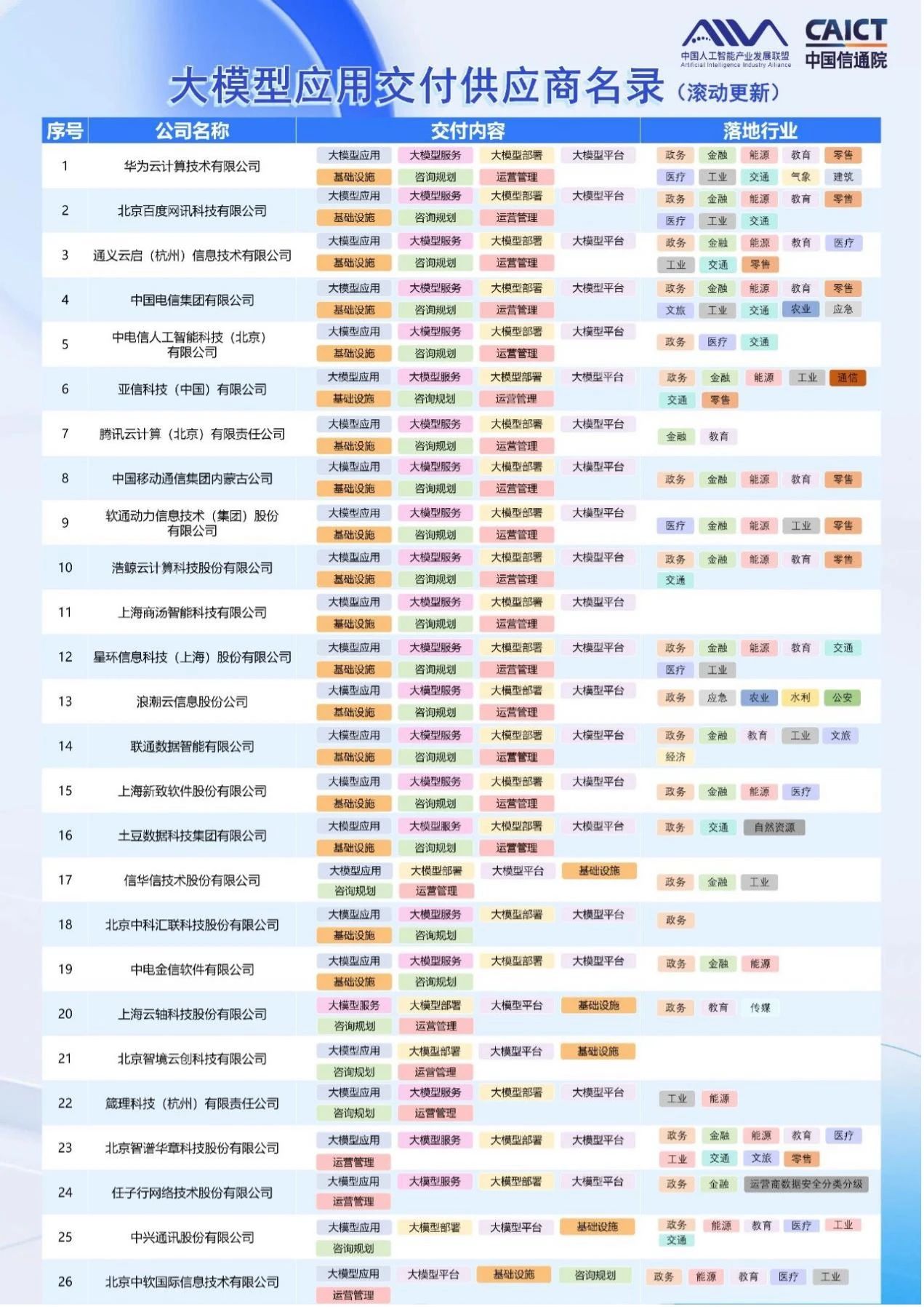 美林?jǐn)?shù)據(jù)入選由中國信通院與中國人工智能產(chǎn)業(yè)發(fā)展聯(lián)盟聯(lián)合發(fā)布的《大模型應(yīng)用交付供應(yīng)商名錄》。美林?jǐn)?shù)據(jù)大模型交付能力涵蓋大模型應(yīng)用、大模型部署、大模型咨詢規(guī)劃、大模型運(yùn)營管理4大方向;大模型落地行業(yè)聚焦能源、工業(yè)、教育3大領(lǐng)域。
