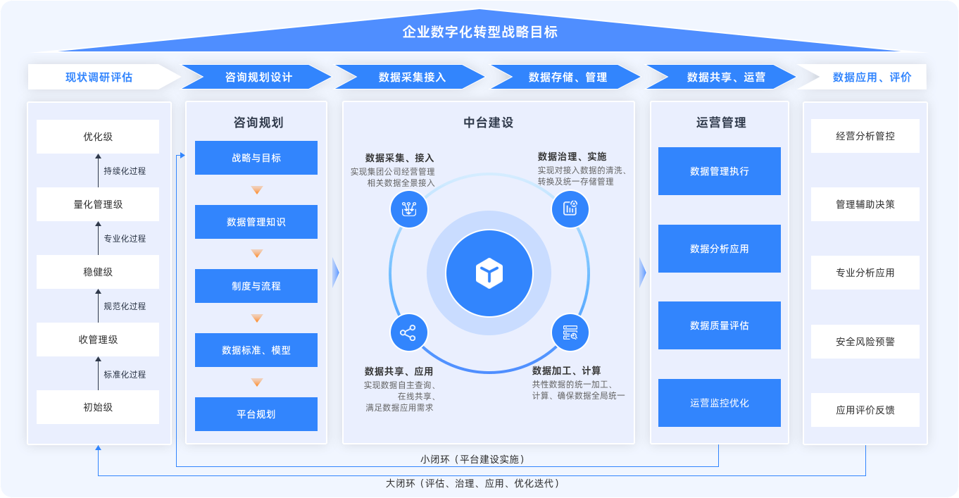通過構(gòu)建數(shù)據(jù)治理體系與數(shù)據(jù)中臺,實(shí)現(xiàn)集團(tuán)數(shù)據(jù)標(biāo)準(zhǔn)統(tǒng)一、質(zhì)量提升與跨系統(tǒng)融合,支撐業(yè)務(wù)創(chuàng)新與精準(zhǔn)決策。強(qiáng)化數(shù)據(jù)安全與合規(guī)控制,培養(yǎng)專業(yè)團(tuán)隊(duì),確保數(shù)據(jù)管理長效良性運(yùn)轉(zhuǎn),全面提升集團(tuán)管控業(yè)務(wù)與管理職能。